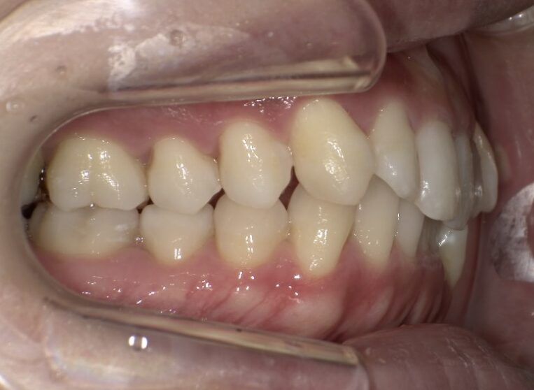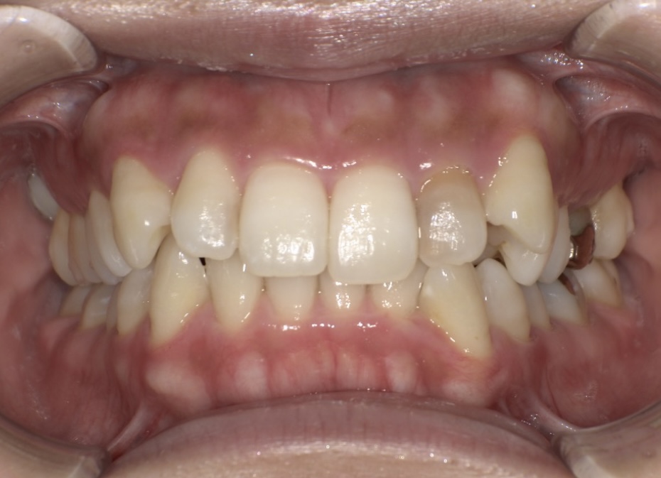 最初に来られた際の写真です。上の前歯が前側にありますが内側を向いており、前歯の噛み合わせが深い状態であり、ガタガタもあります。